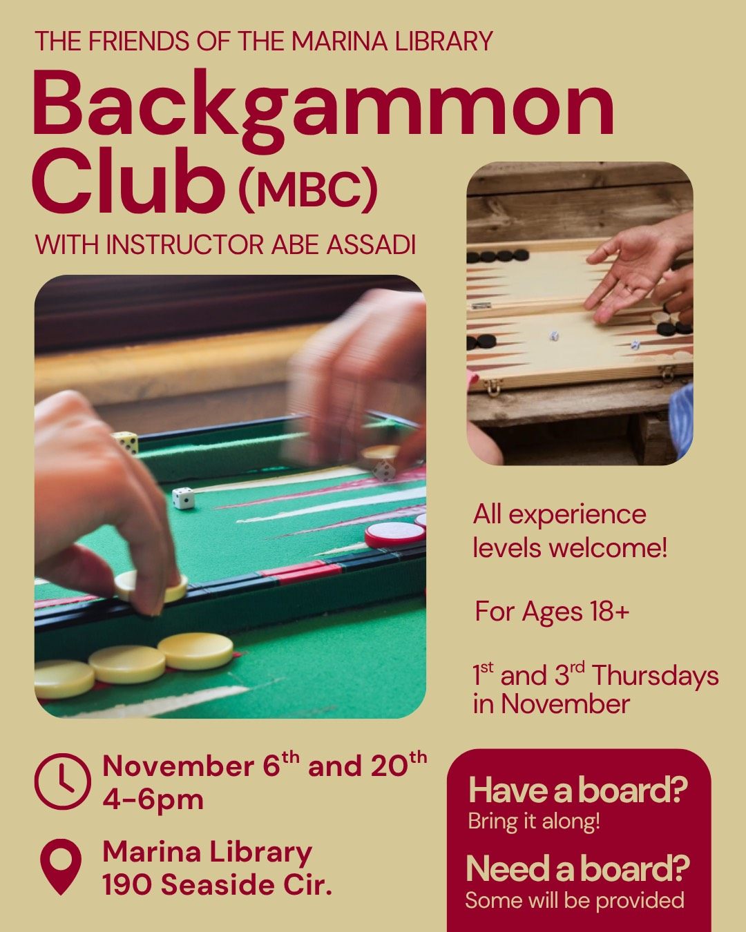 Instructor Abe Assadi teaches how to play the classic game Backgammon, with tips, tricks, and methods to improve your skills. For all levels, beginner to advanced, and ages 18+, it’s bound to be a full of learning experiences and practice. Bring your board or borrow one, build community, and have fun!
