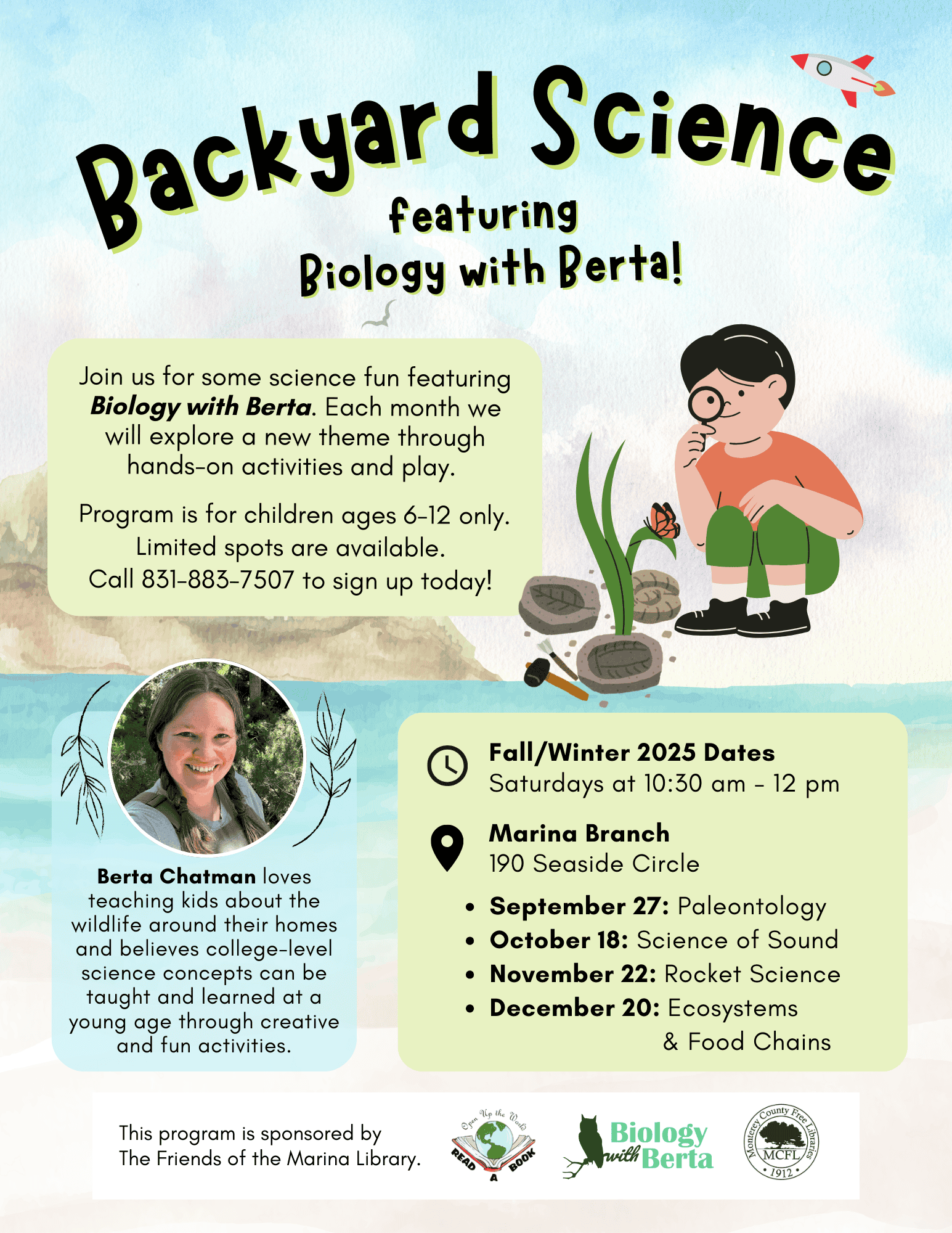 Join us for some science fun featuring Biology with Berta. Each month we will explore a new theme through hands on activity and play. Program is for children ages 5-12 only.