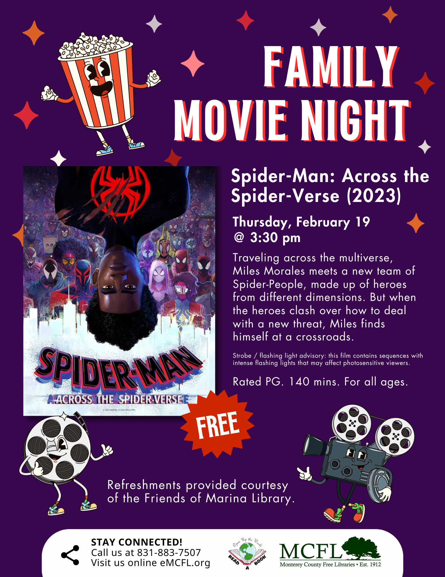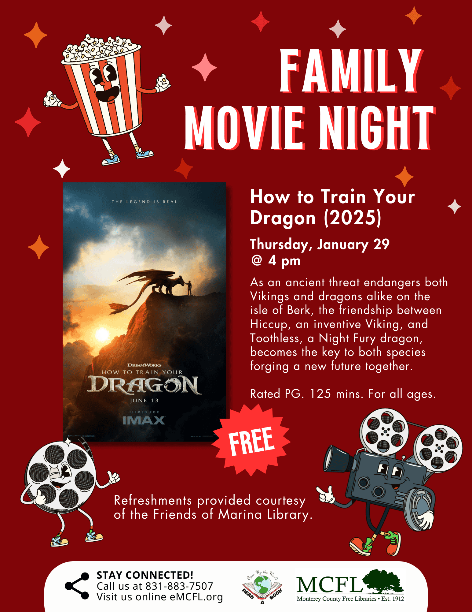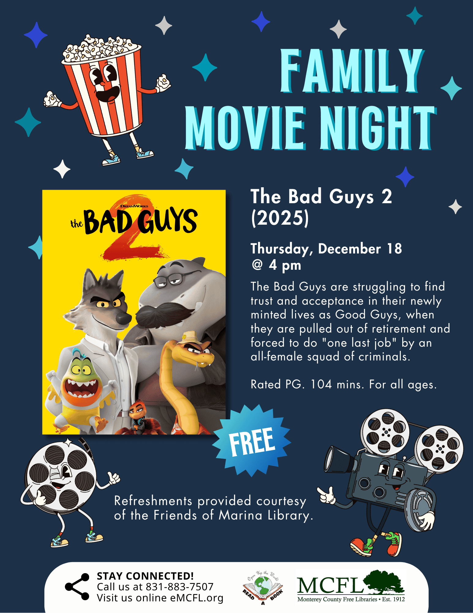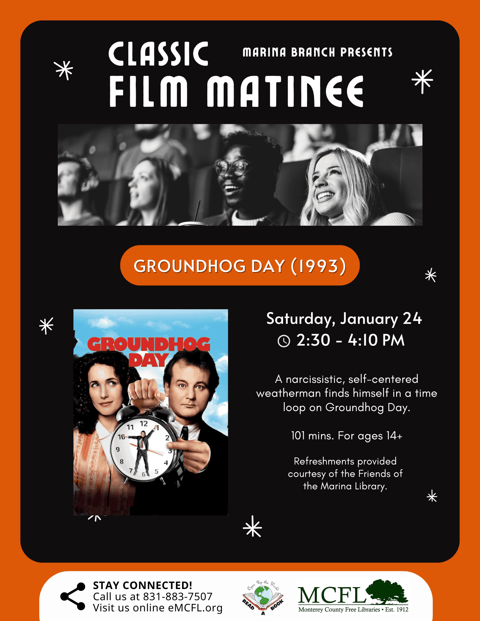 Each month the Marina Library screens a variety of films to meet our diverse audiences. Each movie screening is free and refreshments for attendees are provided. Please see the flyer below to see what’s screening this month!