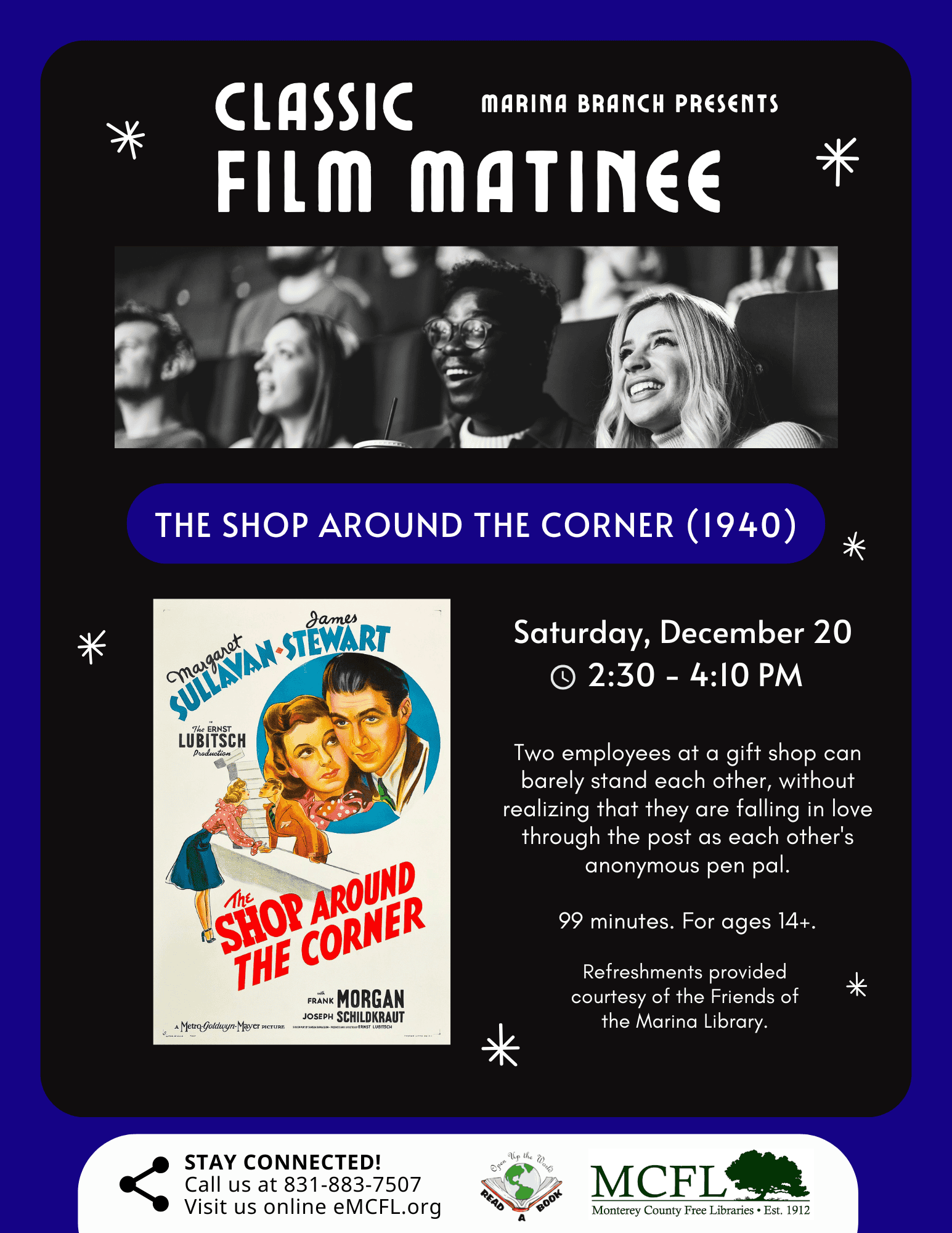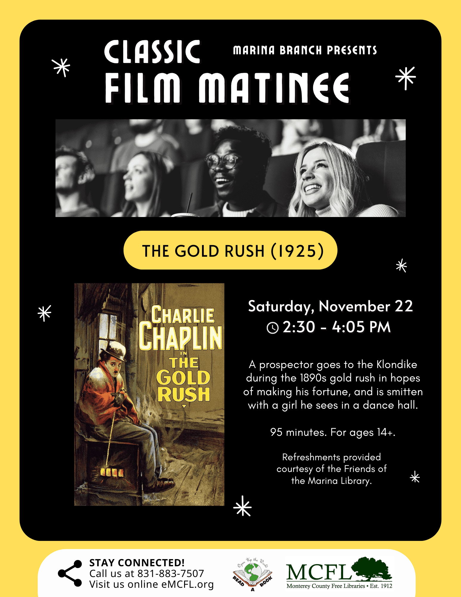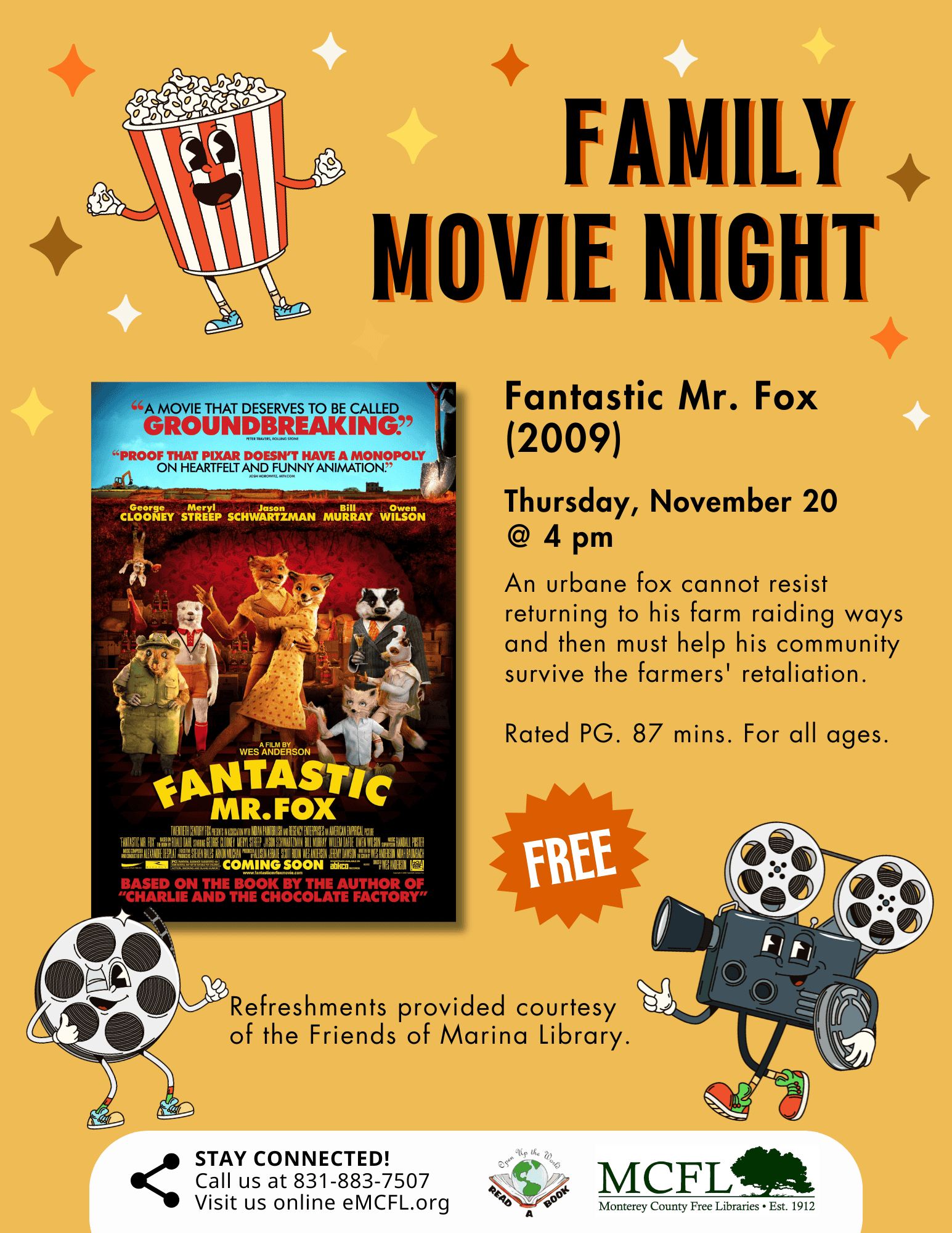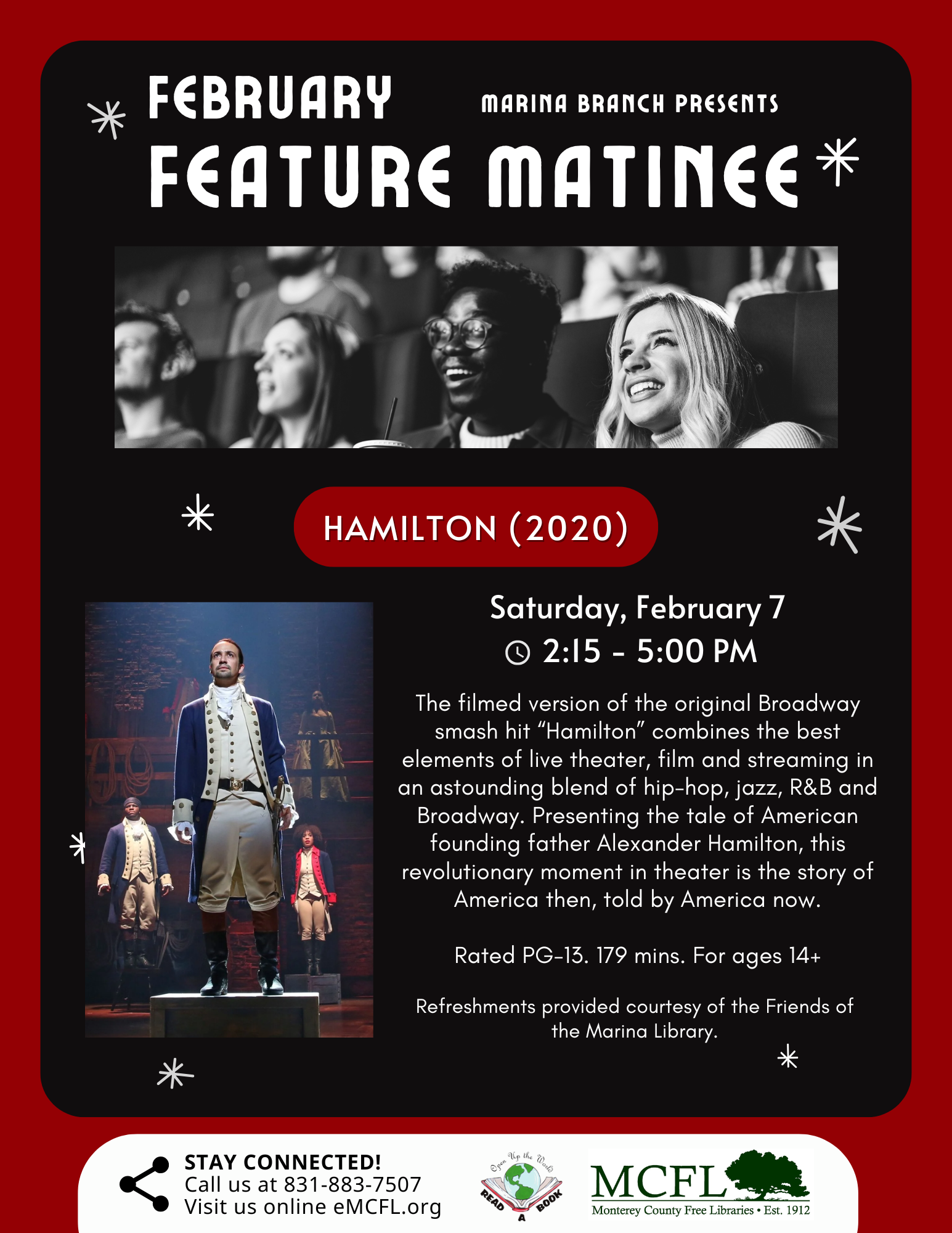 Each month the Marina Library screens a variety of films to meet our diverse audiences. Each movie screening is free and refreshments for attendees are provided. Please see the flyer below to see what’s screening this month!
