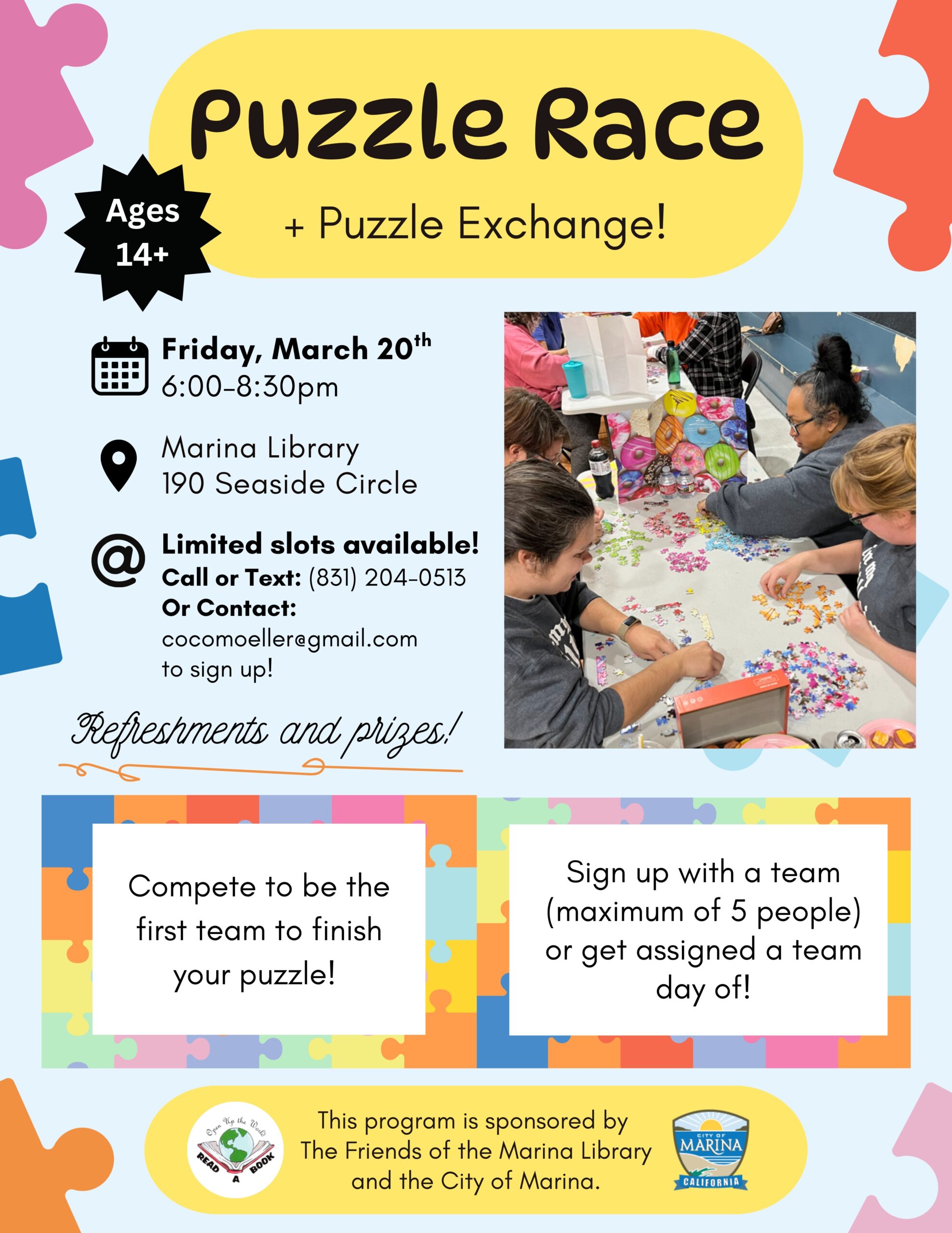 Puzzle Race: Sign up to participate at 831-204-0513 or cocomoeller@gmail.com